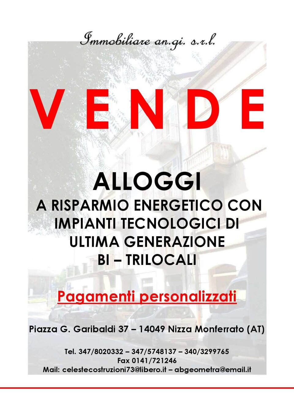 L'IMMOBILIARE AN.GI. propone in vendita n. 4 appartamenti e n. 2 autorimesse di nuova costruzione ubicati in Piazza Giuseppe Garibaldi (centro di Nizza Monferrato).